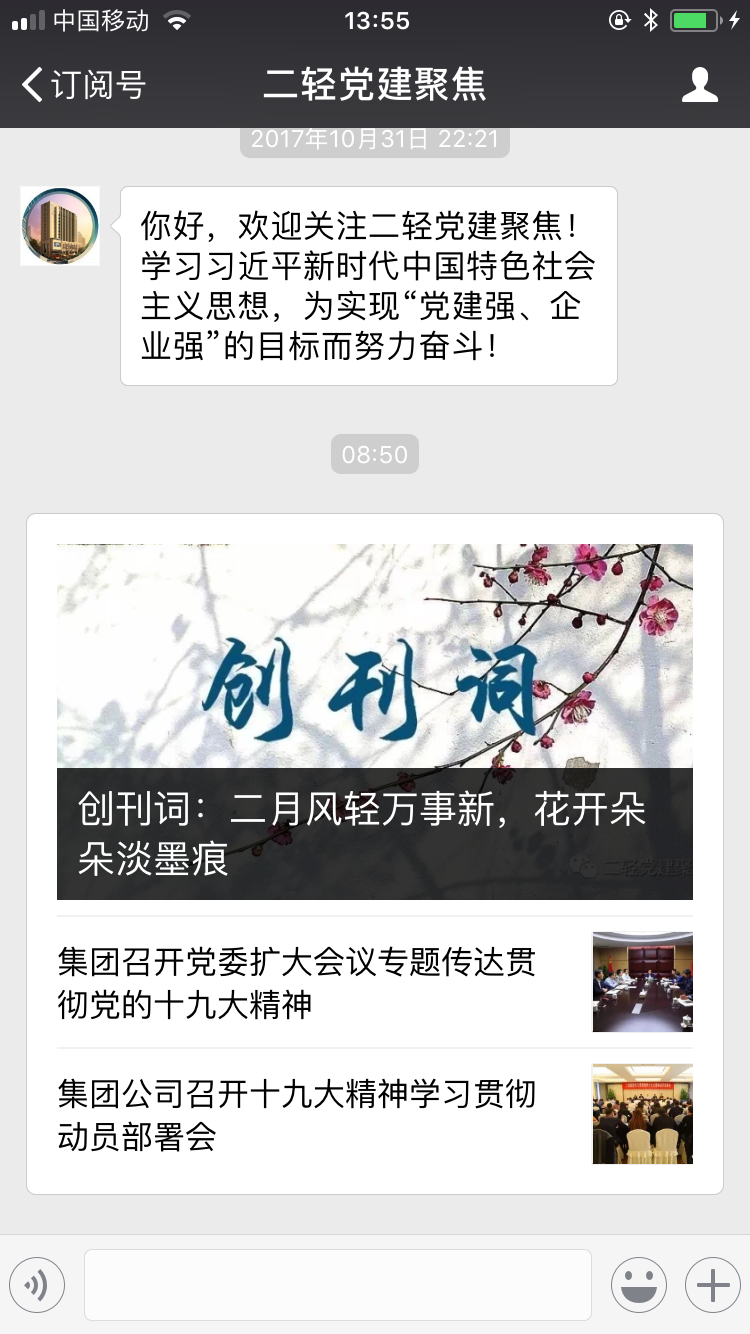 加強黨建工作宣傳有利于統(tǒng)一集團上下思想、凝聚黨員群眾力量、傳播企業(yè)文化。在集團領(lǐng)導(dǎo)的高度重視和悉心指導(dǎo)下,微信公眾號《二輕黨建聚焦》正式上線運行,請二輕全體員工關(guān)注、閱讀、轉(zhuǎn)發(fā)公眾號推送的文章,積極向公眾號投稿或留言,通過全體二輕人共同的關(guān)心和參與,使其成為數(shù)字信息時代集團黨委的喉舌、黨建宣傳的窗口。