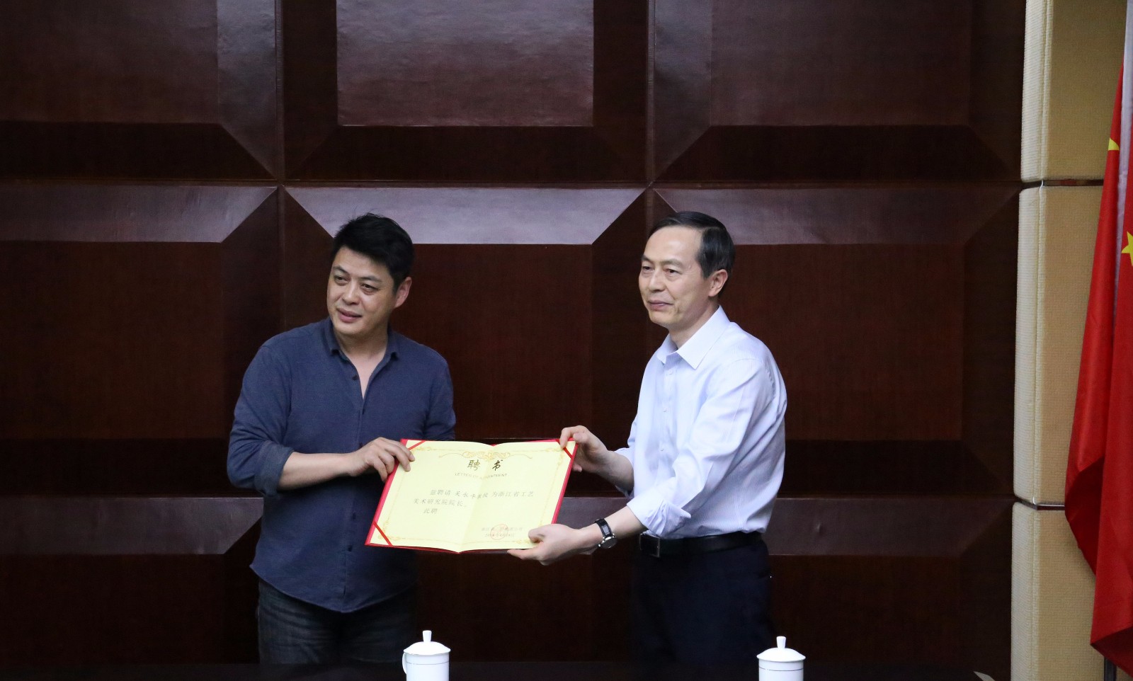 4月22日,省委宣傳部原常務副部長胡堅、中央美術學院吳永平教授、西湖大學堂秘書長王偉等一行蒞臨集團公司,與集團公司黨委書記、總經理虞岳明,副總經理吳敏,藝創(chuàng)公司董事長陳巖等圍繞共同推進集團公司文化產業(yè)領域的合作發(fā)展進行了深入交流。虞岳明為吳永平教授頒發(fā)了浙江省工藝美術研究院院長的聘任書。